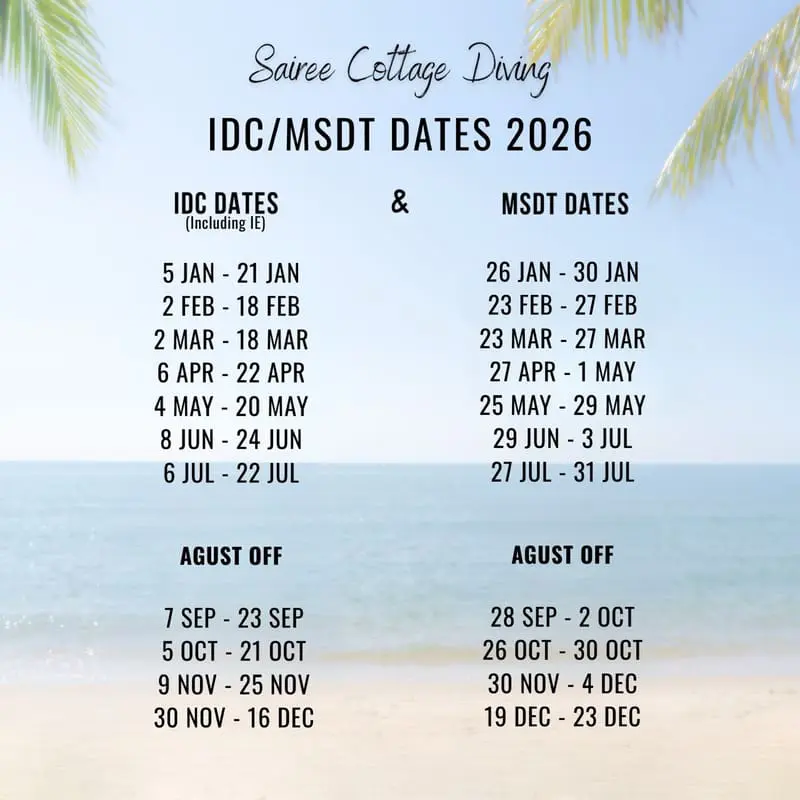 Take your PADI IDC in Thailand on Koh Tao with Sairee Cottage Diving and experience one of the best Diving Instructor Courses (IDC) in Thailand focussing on real-life teaching, advanced risk management, marine conservation, advanced first aid, special diving teaching techniques, positive Dive Instructor attitude, increased standards training, customer service training, extra IDC lessons if needed and 100% personal IDC teaching.